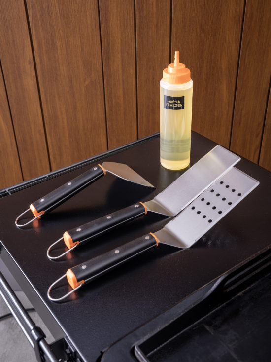 Unlock the full potential of your flat top grill with the Traeger Flat Top Grill Essentials Kit. It includes a set of must-have tools to help you griddle like a seasoned pro. The set of two spatulas—one solid, one slotted—lets you move food around, flip burgers, and more. Use the scraper to keep your flat top grill clear of debris and chop food on the fly. And the squeeze bottle allows precision placement of oil, water, and sauces for frying, steaming, and finishing food.