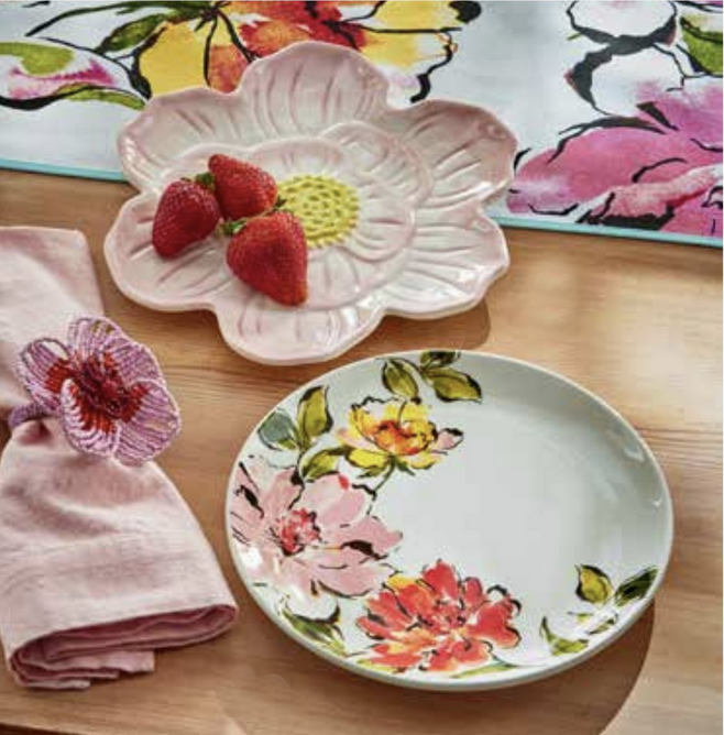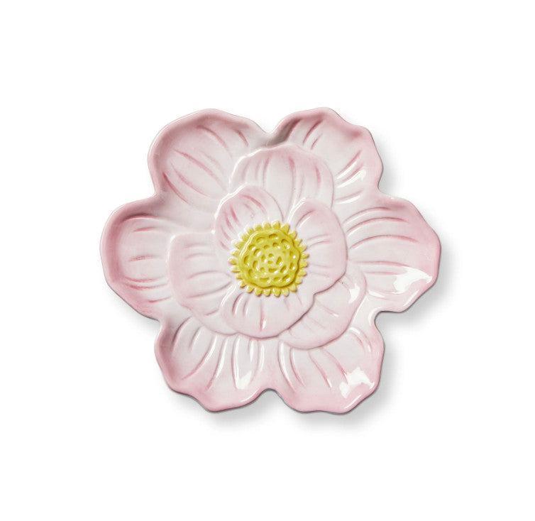 Host a delightful tea party with the Bloom Appetizer Plate in pink. This beautiful earthenware plate features a sculpted floral design with hand-painted details. Perfect for serving small treats and adding a touch of elegance to your gatherings