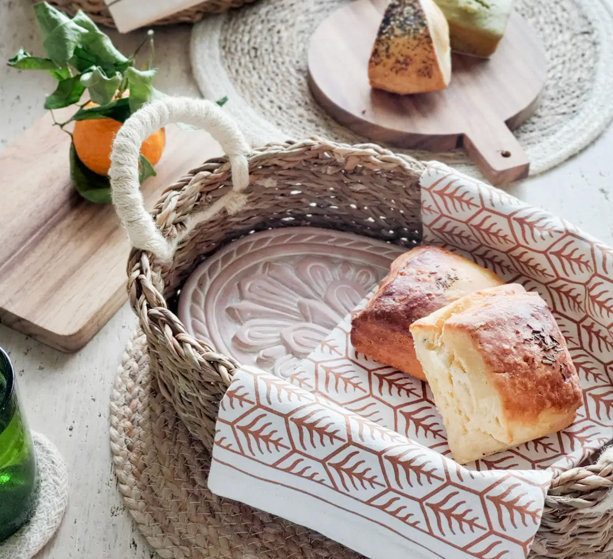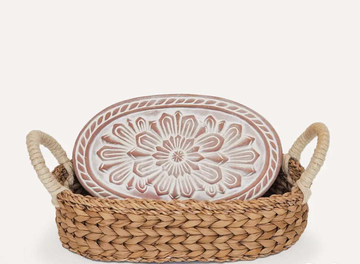 There’s nothing quite like the smell of warm bread on the weekend. This terracotta plate has been engraved with a floral design and cut to fit neatly into a oval basket. This special bread warmer is naturally insulating, and the basket itself has been handwoven from sustainably grown seagrass. It’s the best gift item for anyone who loves bread!