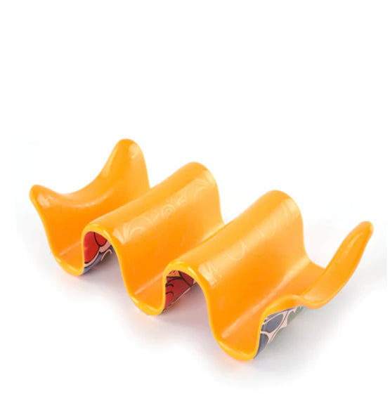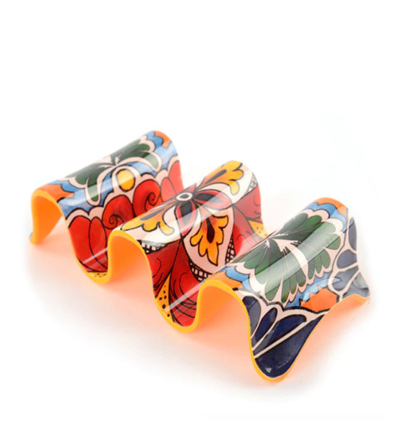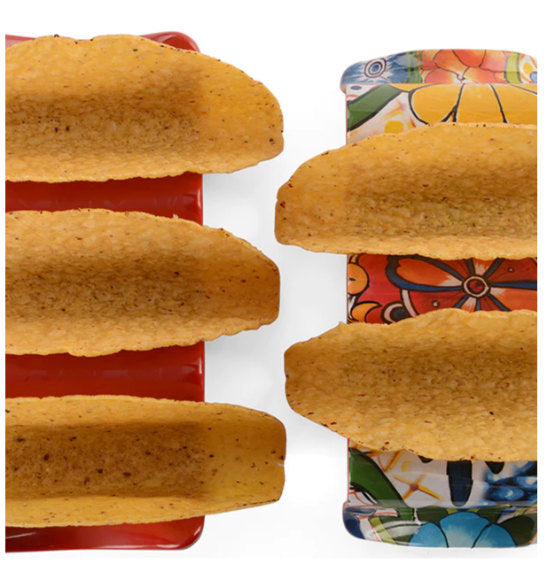 Reversible shape supports 2 or 3 tacos for easy filling and eating. Decorative holder has the look of traditional ceramic with a durable melamine construction. Works with both soft or hard taco shells. Available in blue, red and yellow with unique graphic patterns.
