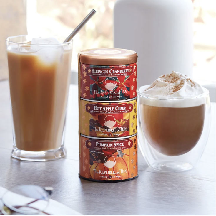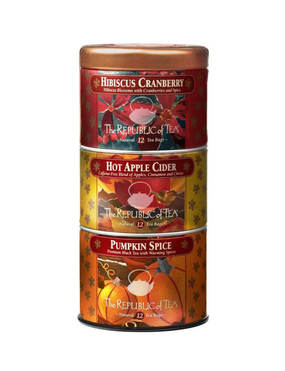 Enjoy the flavors of fall within this convenient stackable tin. Each individual airtight compartment contains 12 natural, unbleached, round tea bags.