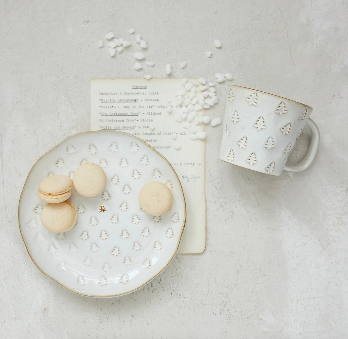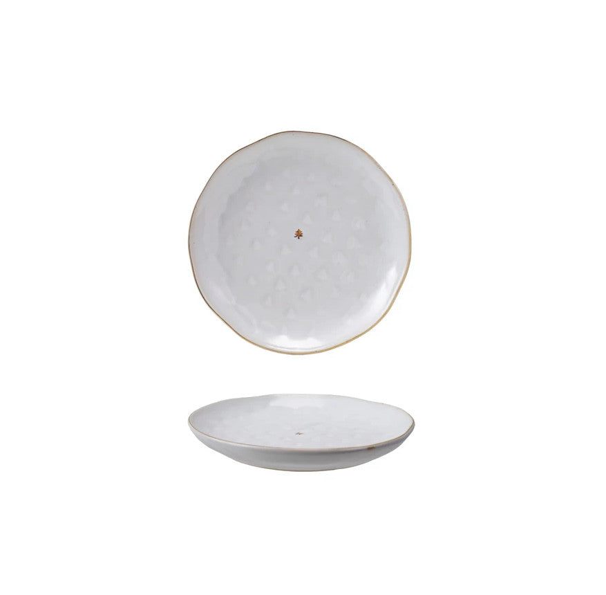6" Round Debossed Stoneware Plate w/ Trees & Gold Electroplating, Reactive Glaze, White (Each One Will Vary)