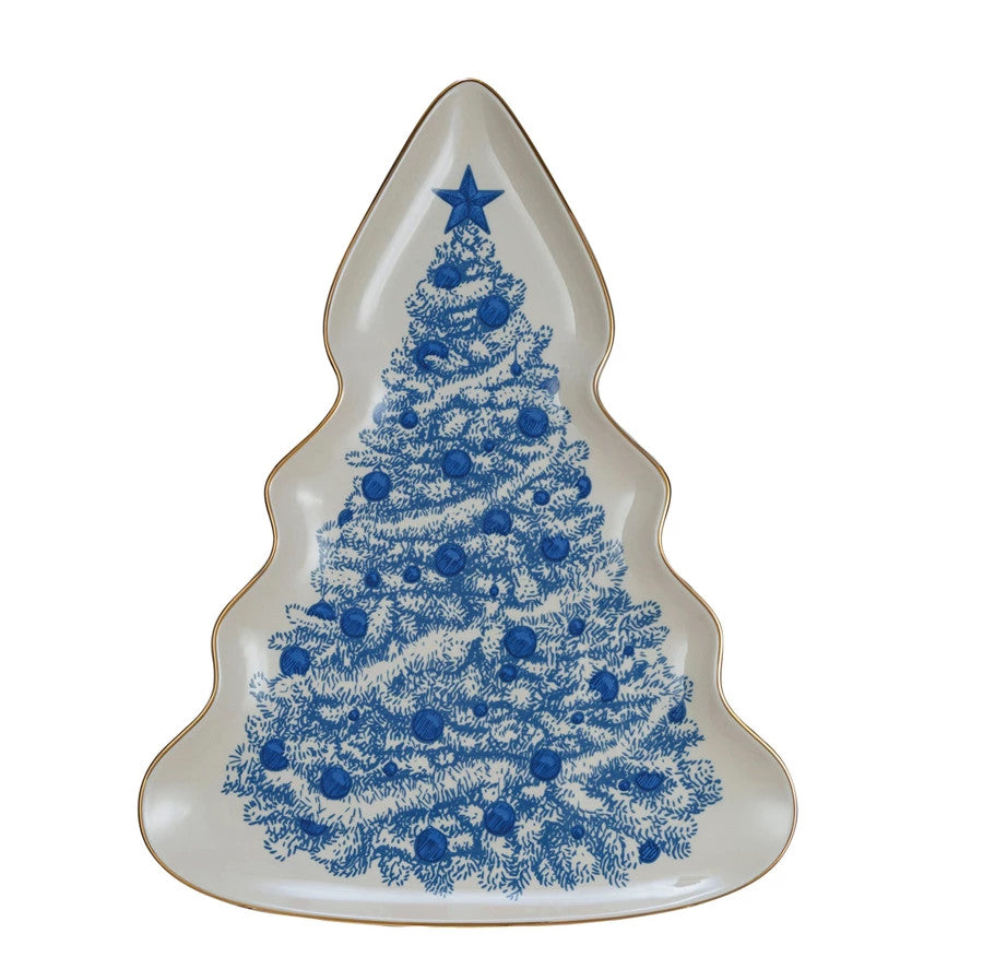 This blue and cream stoneware Christmas tree serving plate with a gold rim is a must-have for festive celebrations. The platter showcases a lovely Christmas tree design that is hand-painted in blue and cream colors, with a touch of gold electroplated rim for extra elegance. The platter is made of durable stoneware that is easy to clean and can withstand oven temperatures. Whether for serving homemade desserts or as a decorative piece, this platter will bring some joy and style to the holiday season.