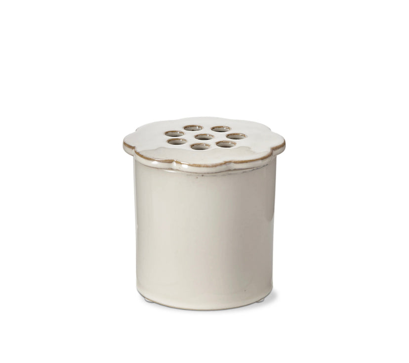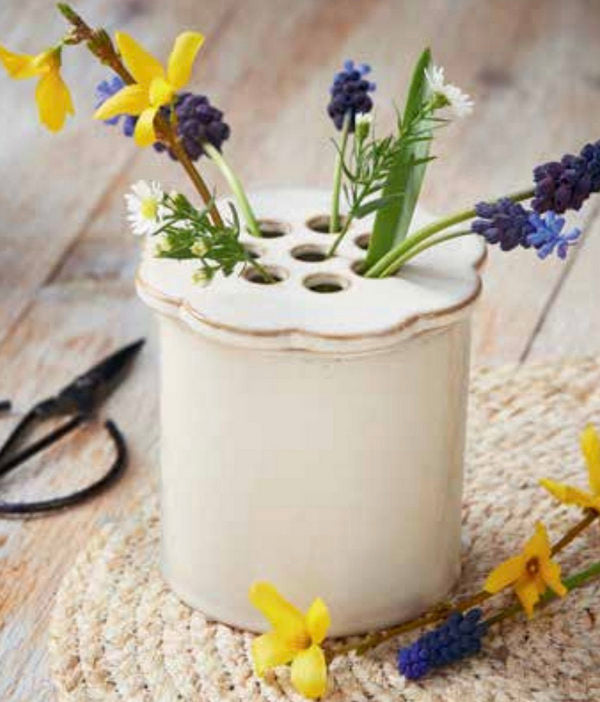 A beautifully crafted frog vase, perfect for showcasing a wide selection of small floral accents. features stoneware construction with reactive glaze details and scalloped lid, this is designed to hold small flowers, replacing the need to use non-biodegradable foam. great for plant propagating and arranging flowers, stems and botanicals. makes a perfect gift for any plant lover, florist or hobby flower arranger.