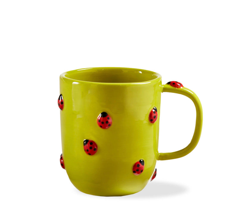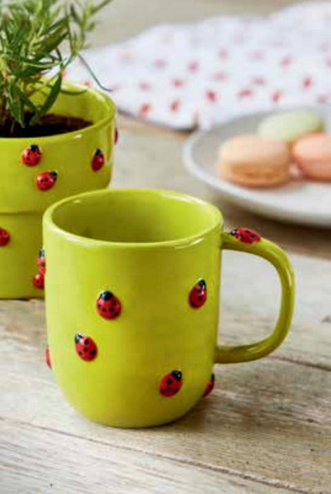 A delightful collectible and perfect gift for ladybug lovers! This mug features a green body adorned with sculpted and hand-painted red and black ladybugs, bringing a touch of garden charm to every sip