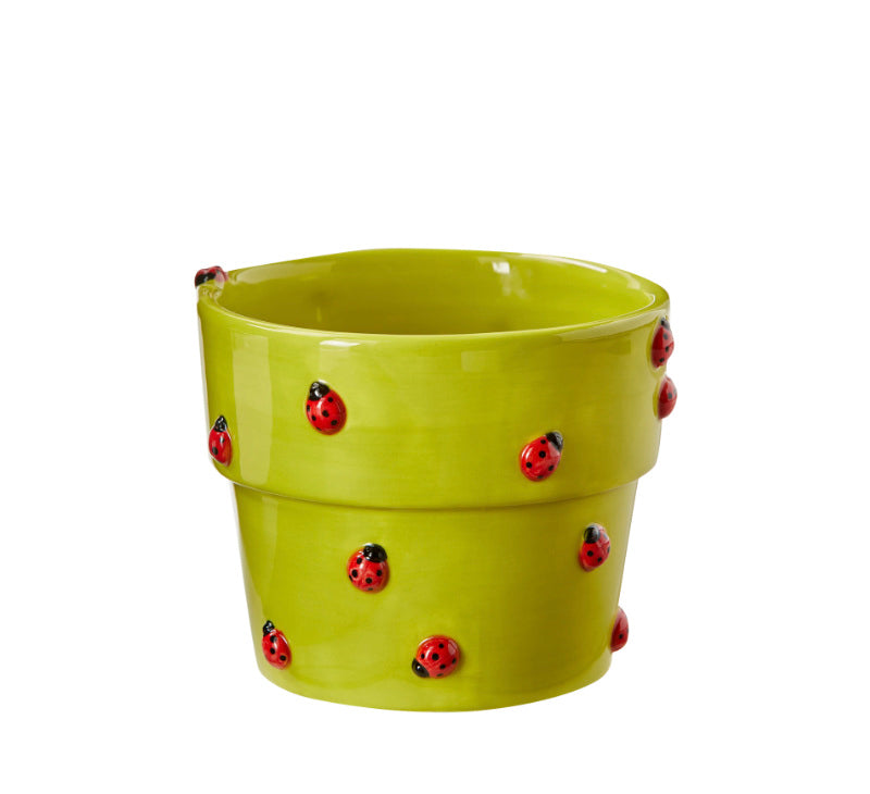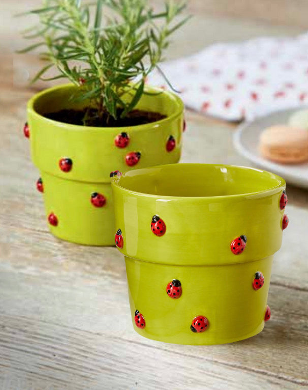 This adorable hand-painted and sculpted earthenware planter features a green body with sculpted red ladybugs. Includes a silicone plug and a bottom center drain hole. A cute addition to any herb garden or counter utinsel holder. Holds up to a 4" drop-in pot