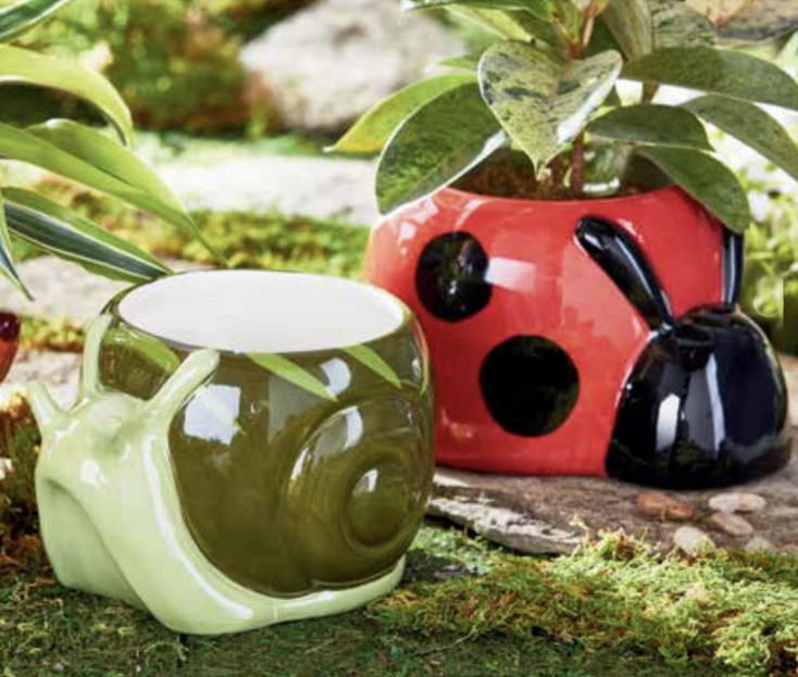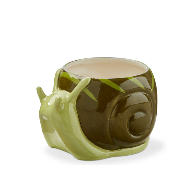 This sculpted and hand-painted earthenware planter in the shape of a snail brings a touch of whimsy to the herb garden or counter utinsel storage. Includes a silicone plug and a bottom center drain hole. Holds up to a 4" drop-in pot.