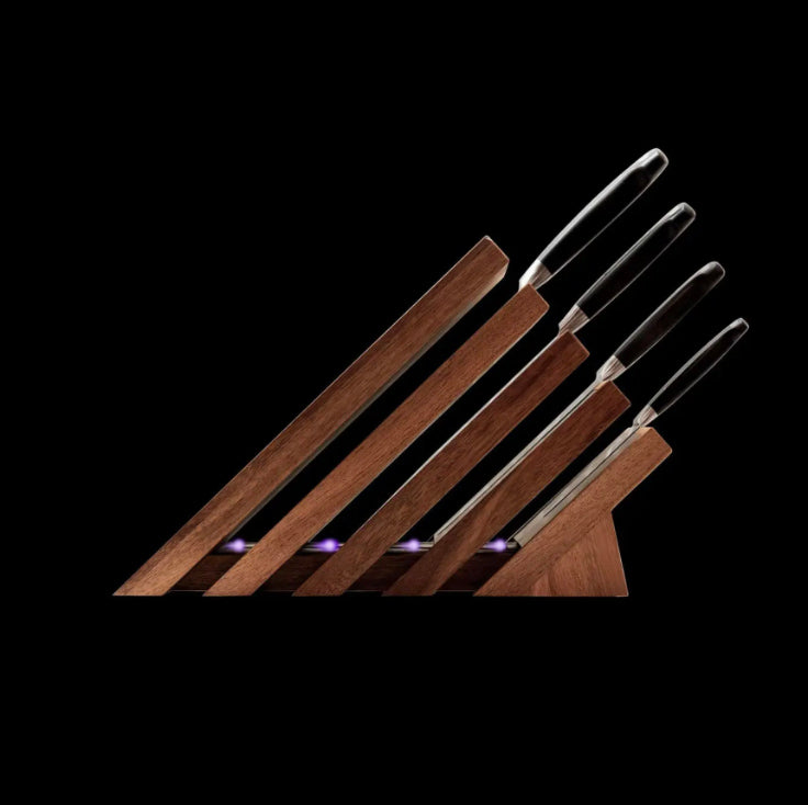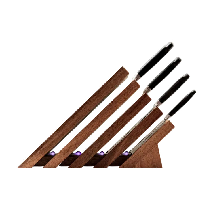 Take your knife storage game to new heights with the Next Level Magnetic Knife Block. Designed for modern kitchens, this innovative block combines soft magnetic pads with ventilated Acacia wood panels to securely and safely store up to 11 knives, steels, and scissors—no awkward slots or limitations. The lighted version features UV LEDs that sanitize the interior with a 5-minute cycle at the touch of a button, promoting a dry, hygienic environment that limits microorganism growth. Sustainably crafted and beautifully finished, the Next Level Block fits blades up to 10.5" long and blends seamlessly into any kitchen décor. Powered by three AAA batteries (not included). Size: 12"w x 9"h x 5"d.