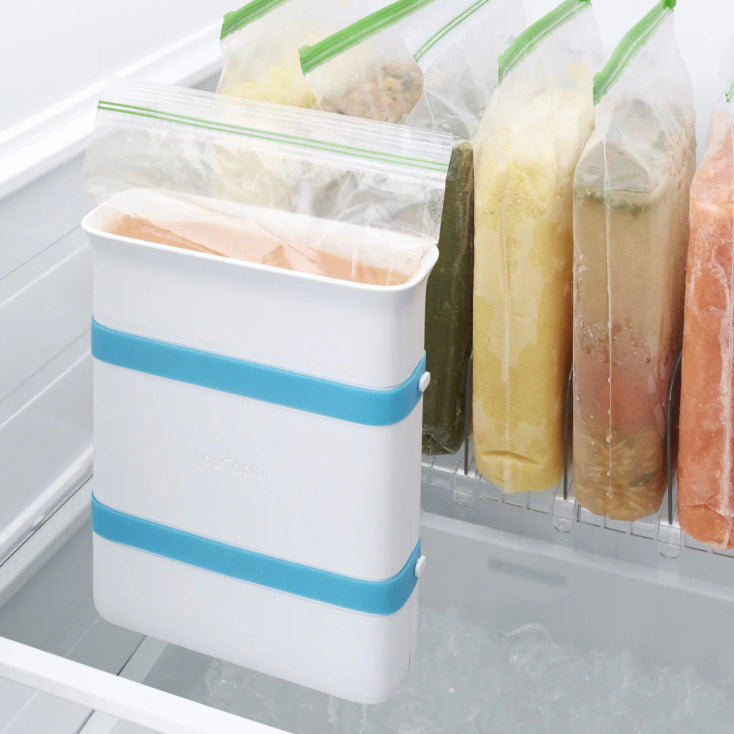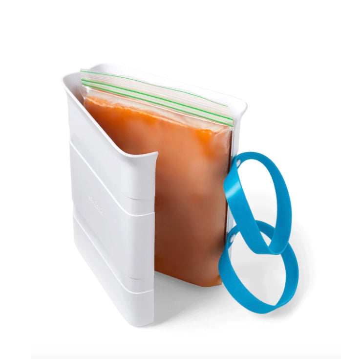 Smart freezing, simplified. Removable silicone bands flex as your food expands, then peel off cleanly to reveal neat, stackable portions.