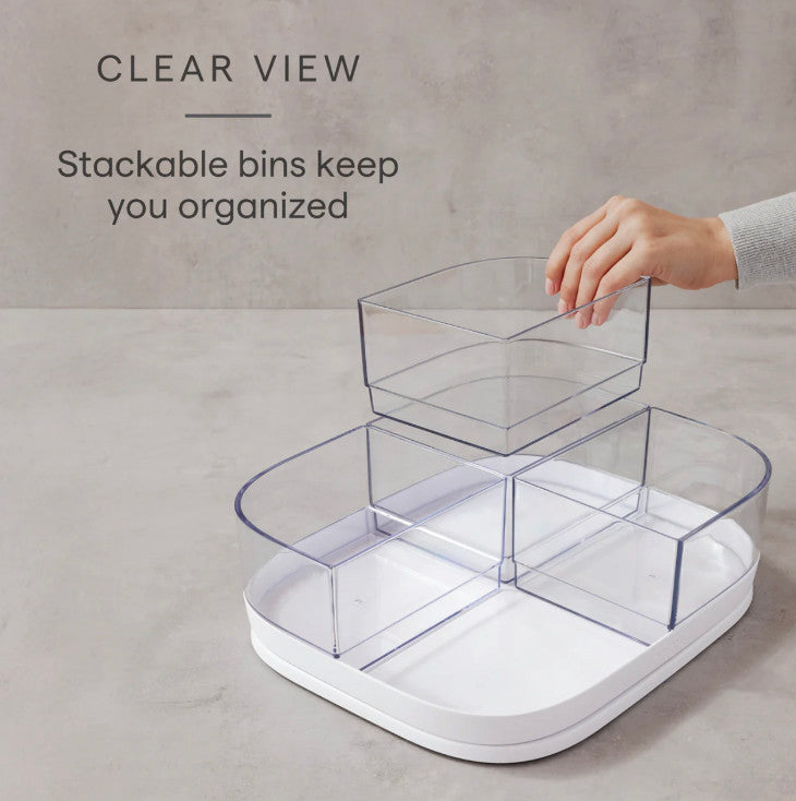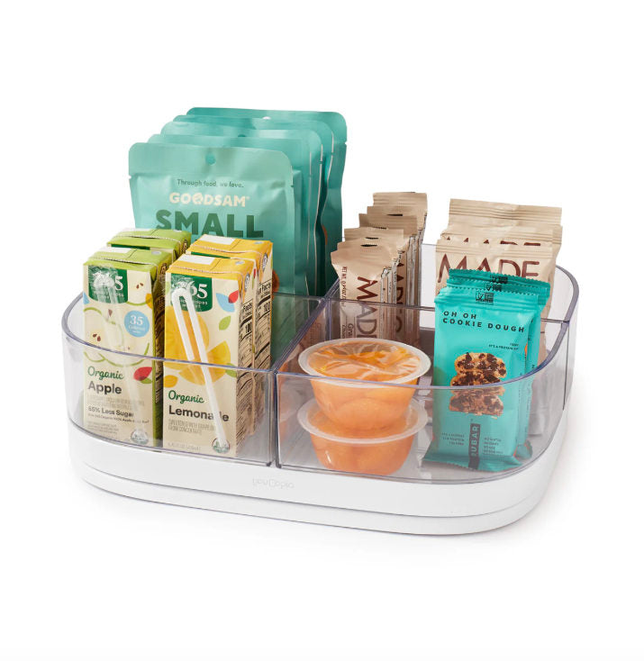 Four clear, stackable bins. Keep snacks, packets, and bottles neatly divided and always visible for quick grabs.