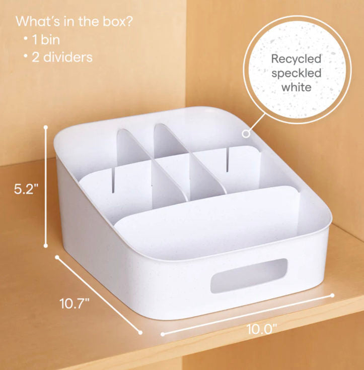 Specs that stack up. Measures 10.7" D x 10.0" W x 5.2" H; crafted from premium, BPA-free, recycled plastic in a clean speckled white finish.