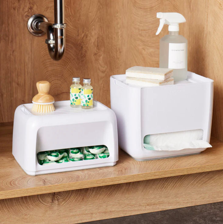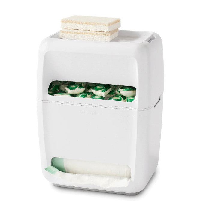 Holds 100+ dishwasher pods and a club-size roll of 13‑gallon kitchen garbage bags — because tidiness should never run out mid‑recipe.