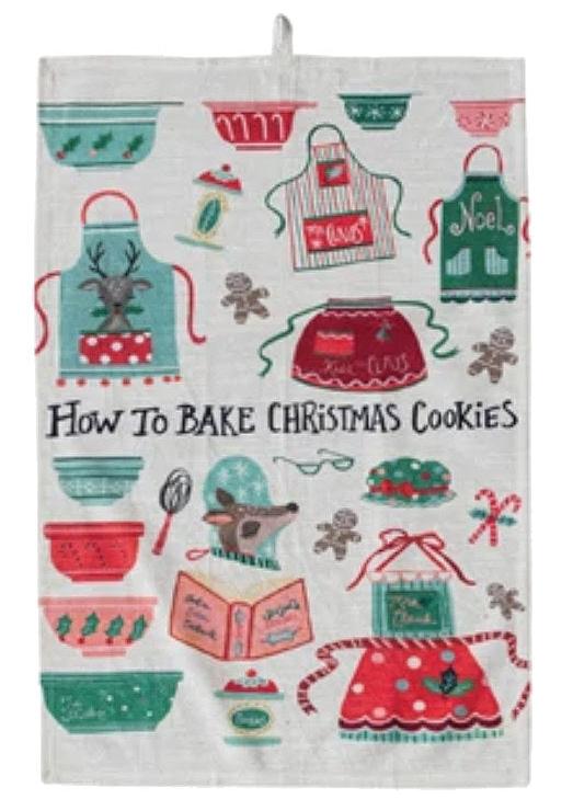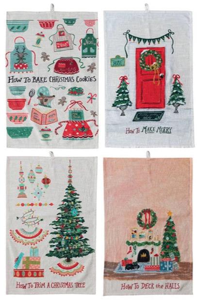 Sold individually these cotton slub printed tea towels features holiday sayings in multicolor, adding a touch of humor and festivity to the kitchen.