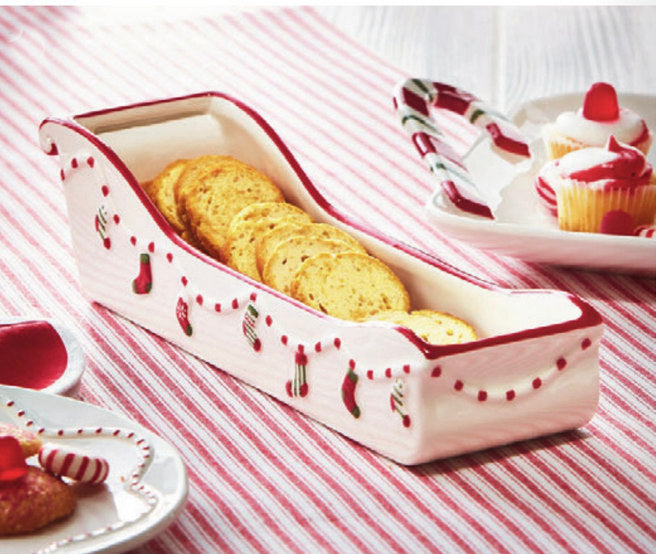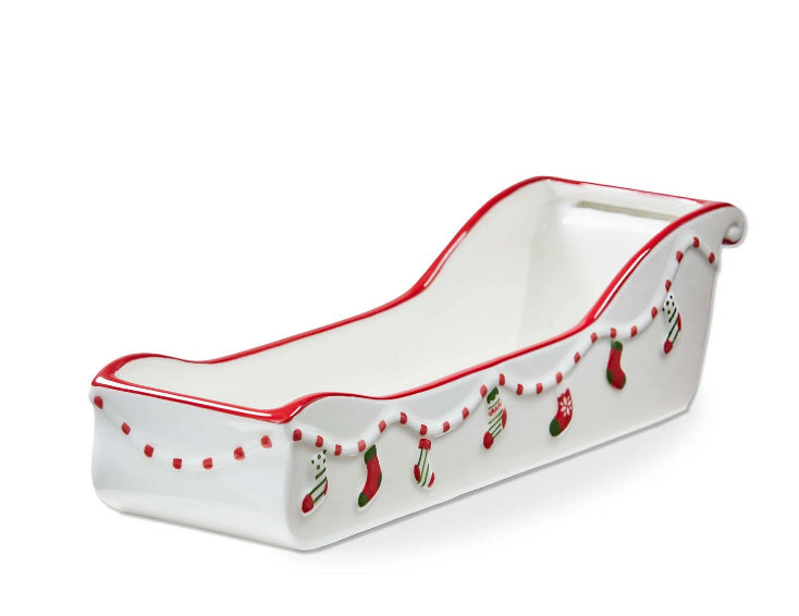 Add a touch of festive fun to your holiday table with this charming Holiday Cheer Sleigh Cracker Dish. Crafted from earthenware, this dish features a festive sleigh design with a red border and stockings, perfect for serving crackers or other small treats
