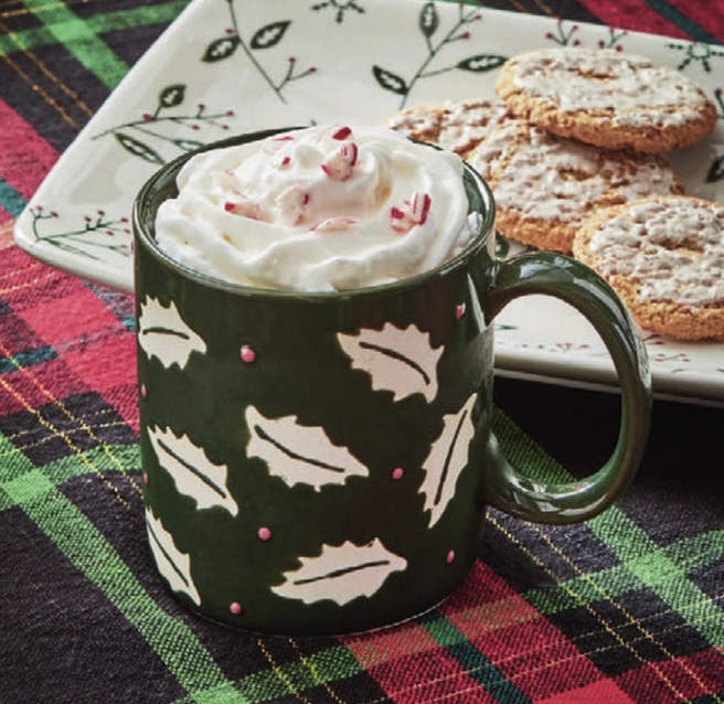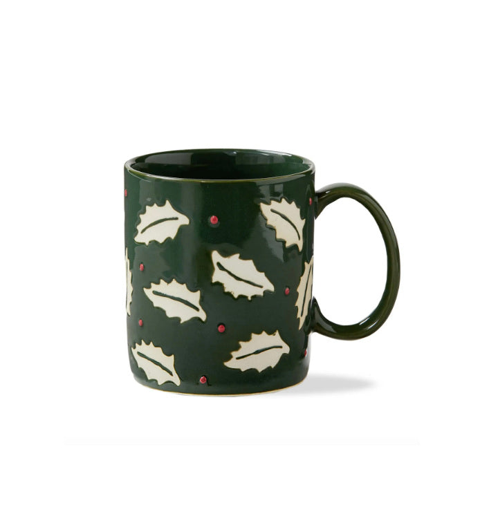 Add a touch of holiday cheer to any morning routine with this 16 oz. holly-inspired mug. Made from durable stoneware, it features a green design with holly leaves.