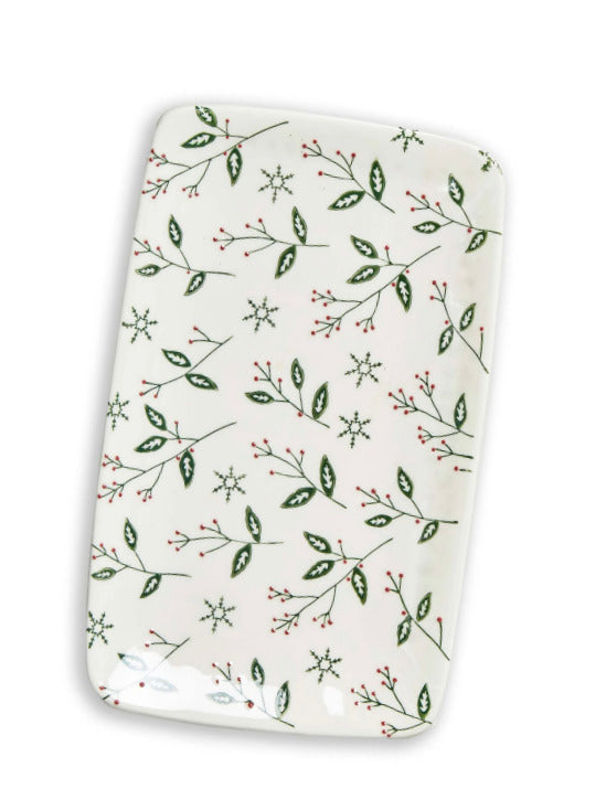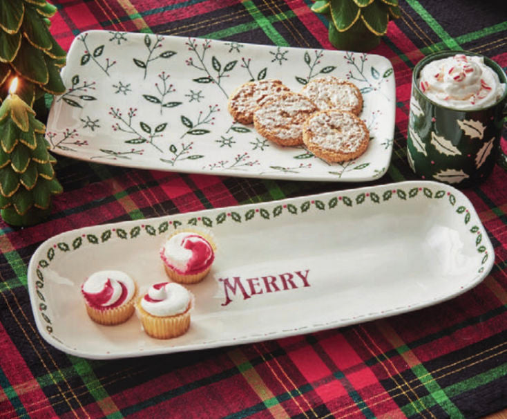 Celebrate the holiday season with this classic Tis the Season Rectangular Platter. Made from stoneware, this platter features a timeless design with green holly leaves, perfect for serving up festive treats.
